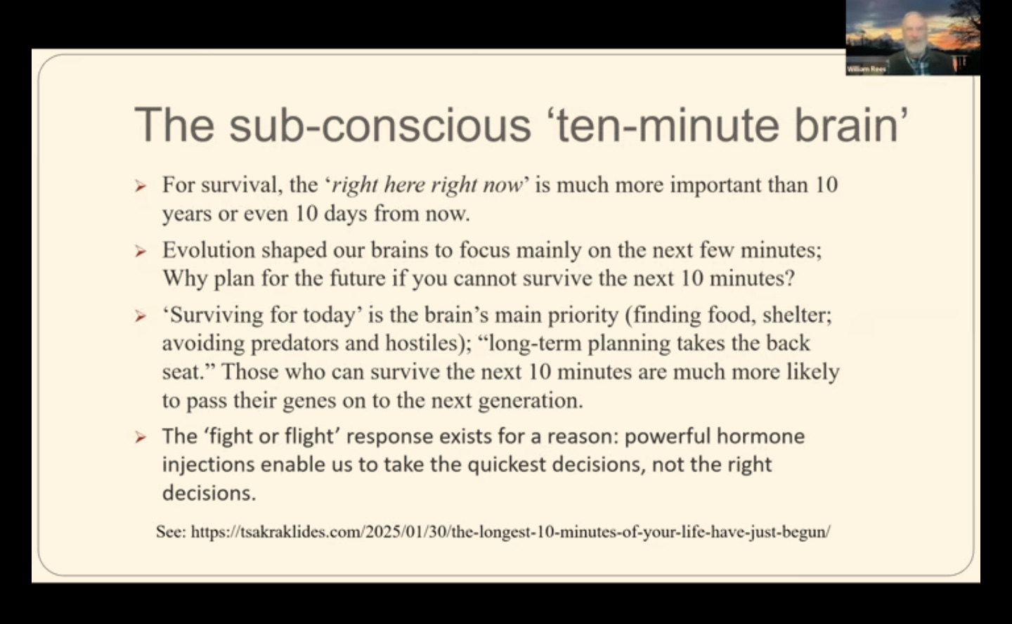 And here George Tsakraklides’s concept of the ‘10 minute brain’, as captured by William E Rees in this talk at CACOR, comes into play. It’s all about what I feel like and want now, or in the next ten minutes, and there are powerful evolutionary forces that explain why this is, as the talk unpacks.